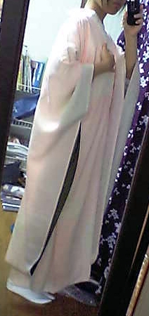 横。衣紋はこれぐらいだけど、キモノが重くて前にずれやすいので、始めはちょっと抜き気味に。