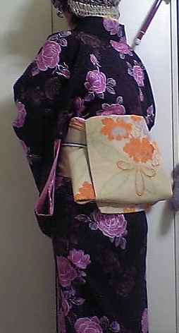ポリエステルの薔薇の袷(3800円)と四天王寺さんで買った中古袋帯(500円)。
