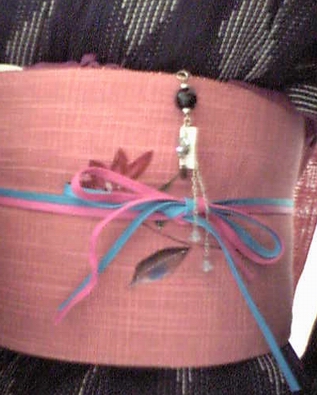 帯はオークションで業者から購入。蝶の単の時と同じ帯です。前の柄は赤い方が出ていますが、裏は青い花で巻き方を変えてそちらを出すことも出来ます。