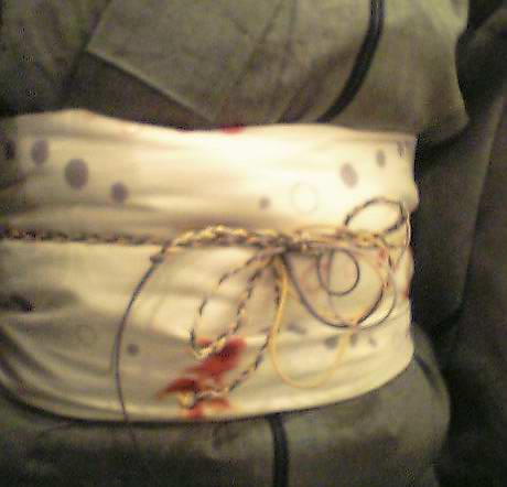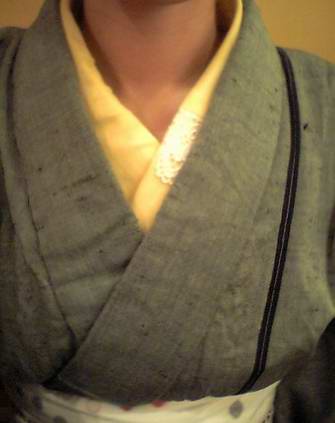 帯締めはワックスコードを適当に編んだもの。コレに合わせて半襟も黄色にしています。実は八掛だったので、継ぎ目があり、それに合わせてレースを縫っています。